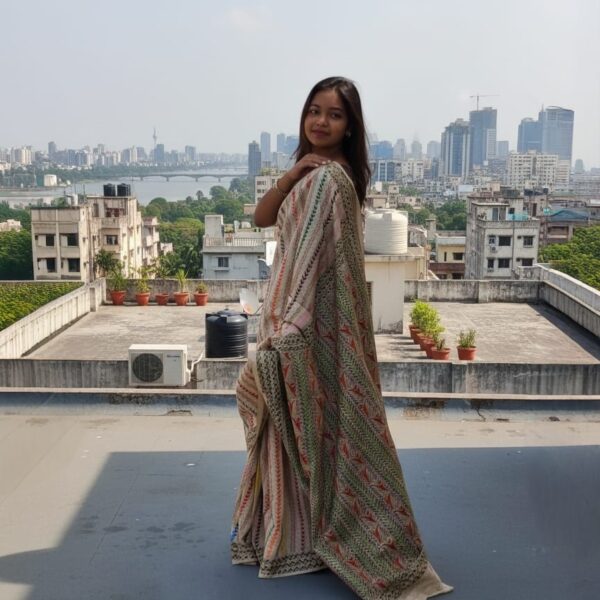 Elevate your ethnic elegance with this beautifully handcrafted Tusser silk saree adorned with traditional Kantha work. Soft, lightweight, and naturally lustrous, this saree features intricate thread embroidery in earthy and vibrant tones, making it perfect for festive occasions, cultural events, and timeless everyday grace.