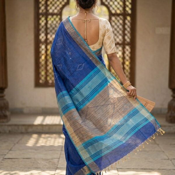 A graceful royal blue handwoven tussar saree from Bhagalpur featuring delicate woven motifs and a contrasting traditional border, perfect for festive and cultural occasions.
