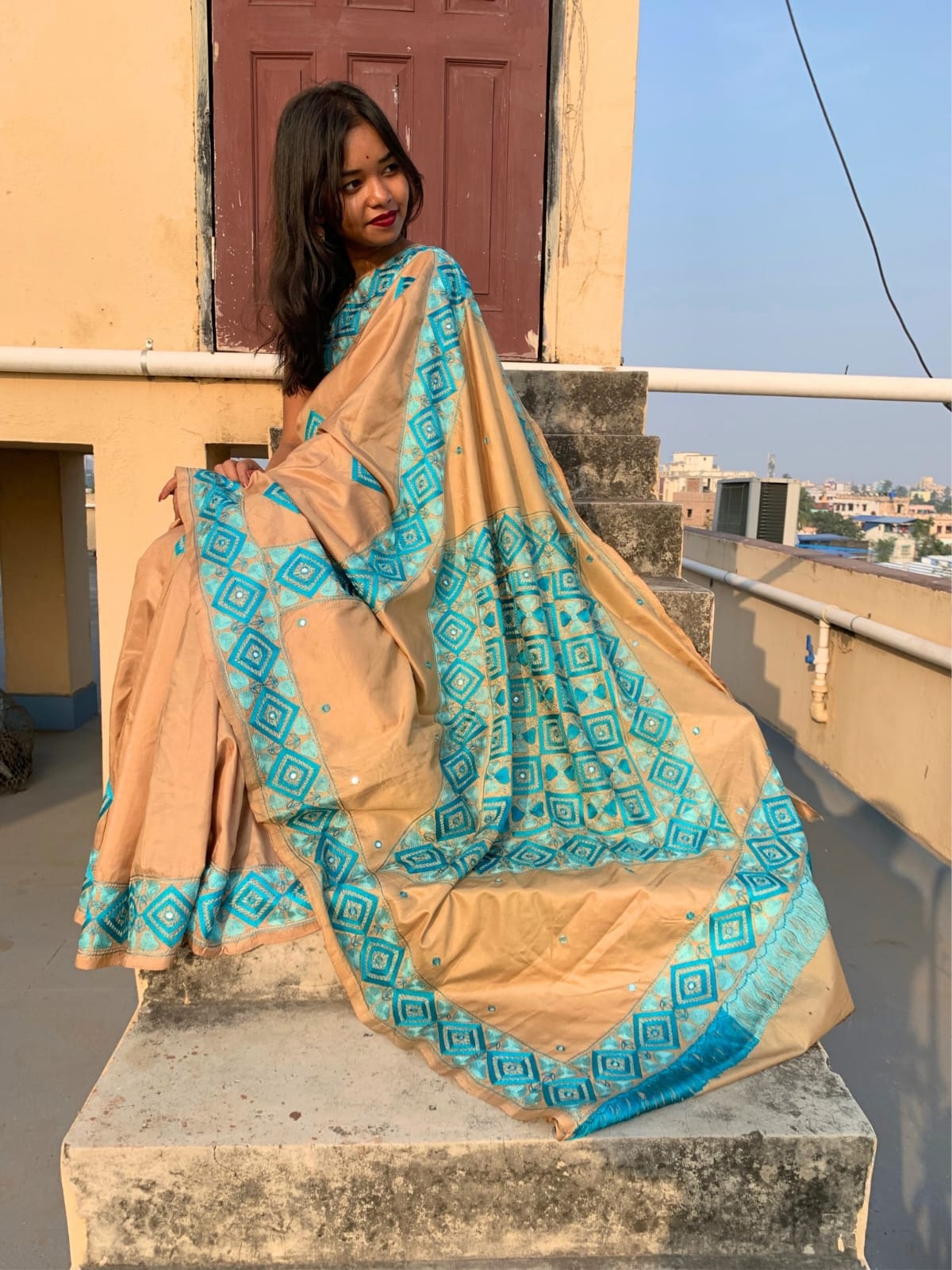 Grace yourself with this stunning Bangalore Silk Saree in a soft beige shade, beautifully adorned with turquoise blue woven motifs. A perfect blend of elegance and tradition, ideal for weddings, festivals, and special occasions.