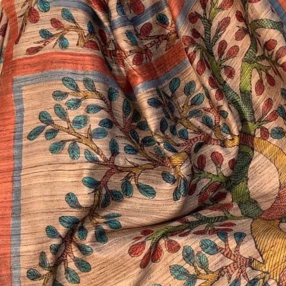 The earthy tones of Tussar silk combined with vibrant hand-painted designs create a perfect balance of tradition and modern style. Lightweight, graceful, and versatile, this saree is ideal for festivals, weddings, parties, and cultural occasions.